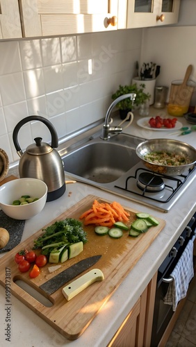 kitchen, cooking, food preparation, vegetable, healthy eating, fresh, organic, culinary, diet, lifestyle, home cooking, chopping board, knife, ingredient, cucumber, carrot, tomatoes, courgette, greener, salad, vegetarian, vegan, wellness, nourishment, sunlight, home, breakfast, lunch, dinner, epicure, food, healthy, cook, cookery, culinary arts, receipe
