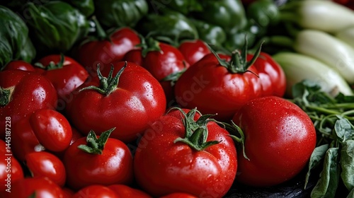 Fresh, vibrant red tomatoes, close-up display at market