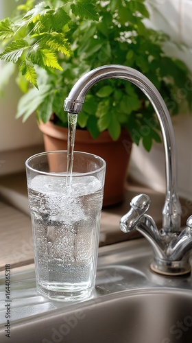 Fresh water flows from a faucet into a clear glass beside a green plant in a sunlit kitchen