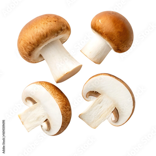 Fresh whole and sliced cremini mushrooms arranged artfully, perfect for culinary inspiration and healthy eating promotion.