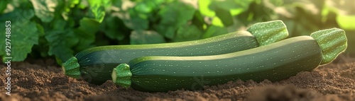 Fresh zucchinis in a garden with green foliage, close-up of vegetables on soil in natural sunlight, perfect for harvest and agriculture content.