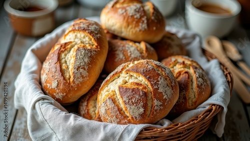 Freshly baked artisan bread rolls in rustic basket on wooden table