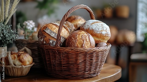 Freshly baked artisan breads in a wicker basket.