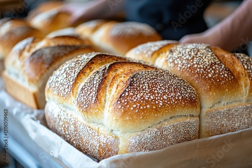 Freshly baked bread sits on the edge of a pan, ready for toasting or serving