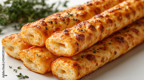 Freshly baked cheese breadsticks with golden crispy crust and herbs arranged on white surface for appetizer presentation, perfect for gourmet food photography