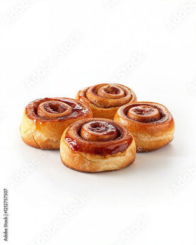 Freshly baked cinnamon rolls placed together on a white background highlighting their golden-brown color and glossy glaze