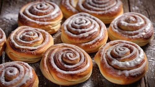 Freshly baked cinnamon rolls with a golden crust, swirls of cinnamon filling, and drizzled with icing. Perfect for bakery, dessert, and food photography, evoking warmth and delicious aroma