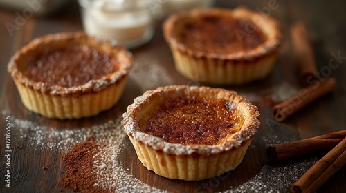 Freshly baked cinnamon tarts dusted with powdered sugar on a rustic wooden table.