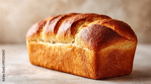 Freshly Baked Golden Brown Loaf of Bread on Rustic Surface with Soft Lighting and Textured Background