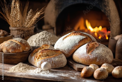 Freshly baked homemade breads on table surrounded by ingredients and a traditional oven