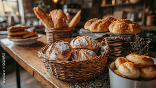 Freshly baked pastries displayed in cheerful bakery interior, featuring various bread types in woven baskets, creating warm and inviting atmosphere