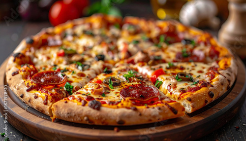 Freshly baked pizza slices with melted cheese and colorful toppings. Appetizing food. Tasty snack.
