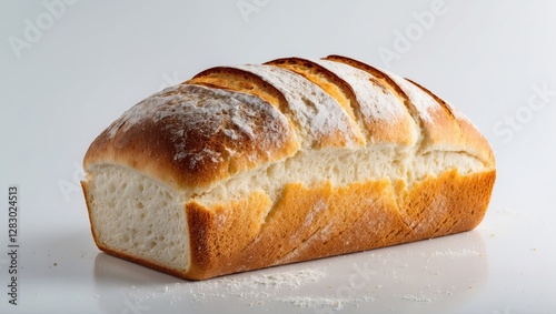 Freshly baked sliced white bread loaf on a white background with flour dusting on the surface