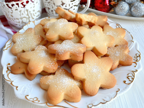 cookie, star, baked, powdered, sugar, fresh, delicious, holiday, christmas, plate, dessert, sweet, treat, deliciously, baked goods, food, homemade, crispy, gold, flaky, sweetness, comfort, tradition, festive, decoration, winter, seasonal, sprinkle, gift, savoury, butter, golden brown, pretty, arrangement, christmas, delightful, treat