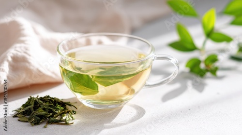 Freshly Brewed Green Tea in Clear Cup with Tea Leaves and Vibrant Green Leaves on Light Background