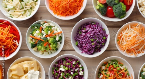 Freshly Chopped Vegetables in Colorful Bowls on a Kitchen Table