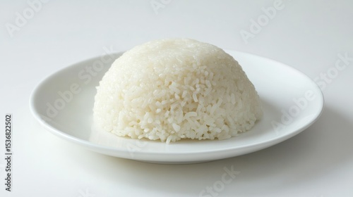 Freshly cooked white rice served on a white oval plate with a simple background, perfect for culinary, food, or diet food presentations