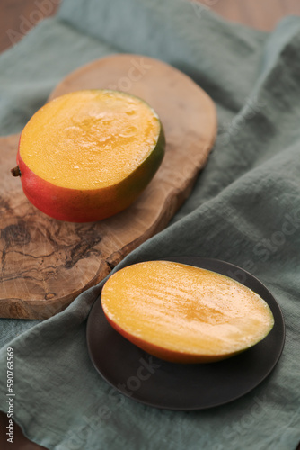mango, fresh, ripe, red, green, tropical, fruit, healthy, sweet, tasty, organic, board, linen, clothes, half, cut, slice, wooden, food, juicy, table, summer, natural, background, yellow, delicious, closeup, agriculture, half, wood, eating, diet, vitamin, raw, pulp, nature