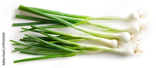 Freshly cut spring onions are isolated and arranged on a white background for a top view photograph, provided with a clipping path.
