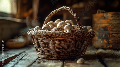 Freshly harvested mushrooms in a rustic wicker basket resting on an aged wooden table surrounded by a warm, inviting atmosphere