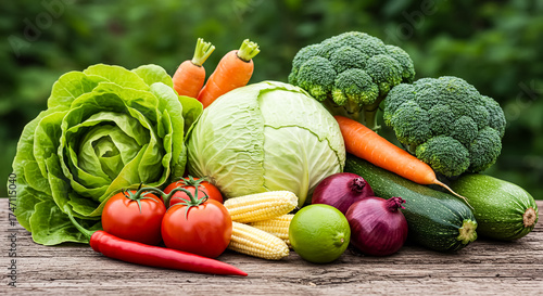 vegetable, fresh, harvest, organic, food, healthy, diet, nourishment, raw, vegan, vegetarian, broccoli, carrot, tomatoes, lettuce, cabbage, corn, lime, onion, courgette, pepper, wooden, rustic, table, garden, farm, agriculture, produce, natural