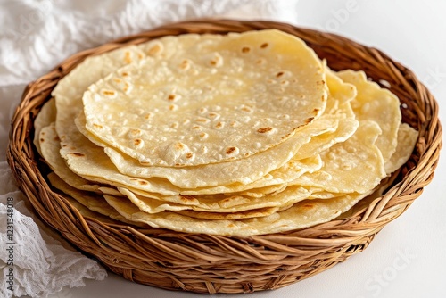 Freshly Made Flatbreads in a Natural Woven Basket on a Bright Background