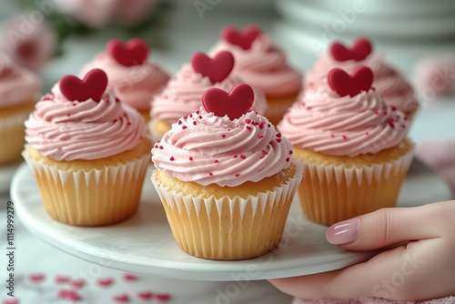Freshly made raspberry cupcakes on kitchen counter. Delicious looking pink cupcakes with raspberry and paper heart topping