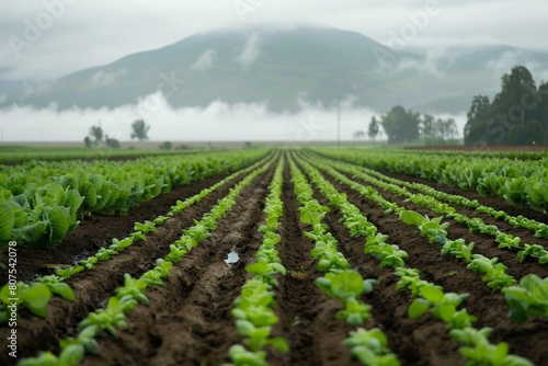 crop, farming, agriculture, vegetable, farmland, field, row, mist, fog, cloudy, dirtied, fresh, green, plant, growth, cultivation, rural, countryside, landscape, natural, sustainable, organic, environmentally friendly, produce, nature, horticulture, kitchen garden, rural scene