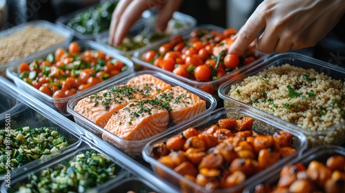 Freshly Prepared Ingredients for Healthy Meal Prep with Salmon, Colorful Vegetables, and Healthy Grains on a Kitchen Counter