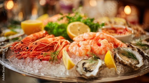 Freshly prepared seafood platter with prawns, crab, and oysters served on a bed of crushed ice, vibrant colors, shallow depth of field, professional stock photo