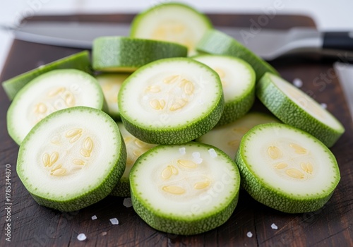 courgette, slice, green, round, vegetable, fresh, food, chopping board, cooking, ingredient, raw, healthy, seed, wood, salt, kitchen, preparation, diet, organic, produce, squash, courgette, closeup, macro, detail, texture, vibrant, ripe, chopping, meal, white, yellow, vegetarian, vegan, nourishment