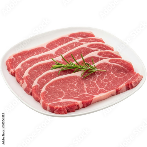Freshly sliced raw beef steak on a white plate with garnish isolated on transparent background