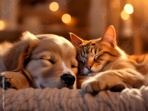 Freunde fürs Leben. Hund und Katze kuscheln in weichem licht. Stimmungsvolles Charakterbild.