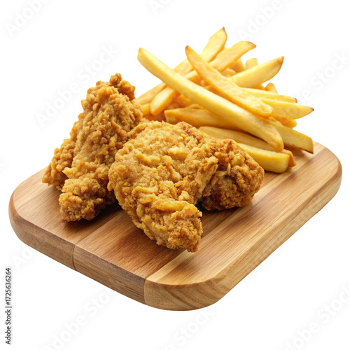 chicken, fried, fries, french, wooden, board, food, fast food, crispy, meal, hot, crunchy, comfort, macro, closeup, isolated, white, background, plating, snack, salty