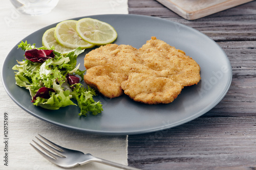 Fried chicken breast fillet on a gray plate with fries. Country style