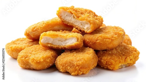 food, chicken, nugget, fried, crispy, breaded, meat, poultry, cookery, delicacy, dish, snack, meal, fast food, gold, brown, crunchy, texture, white, background, isolated, studio, photo, object, closeup, detail, delicious, tasty, appetising, preparation, cooking, eating, dinner, lunch, gastronomy, culinary, protein, pile, stack, crumb, bite, portion, serving