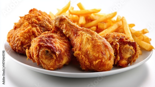Fried chicken with French fries on a plate isolated on white background