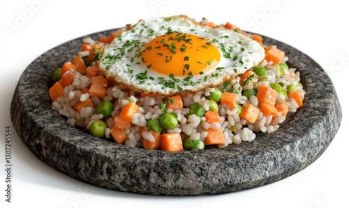 Fried egg atop vegetable rice on dark plate, white background; healthy meal food photography