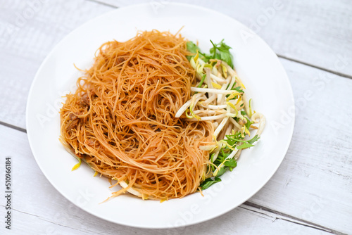 fried noodles vermicelli on white plate , Chinese styled fried noodle with bean sprout and coriander on wooden table - Thai food