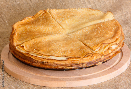 Fried pancakes lie on a wooden cutting board. The concept of baking. Horizontal image.