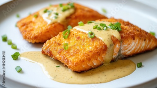 salmon, fish, fried, fillet, cookery, dish, meal, dinner, lunch, healthy, seafood, protein, epicure, eatery, delicious, tasty, sauce, creamy, chives, garnish, white, plate, cooked, prepared, portion, serving, nourishment, omega, three, fats, acid, fat, culinary, receipe, cooking, crispy, gold, brown, closeup, background, ingredient, fresh, natural, organic, high, angle, view, simple