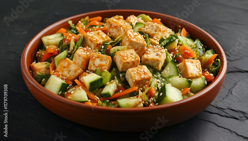 Fried Tofu salad with cucumber and sesame seeds. Homemade Asian salad of vegetables and tofu in ceramic bowl on black stone background. Healthy Asian diet vegetarian salad food