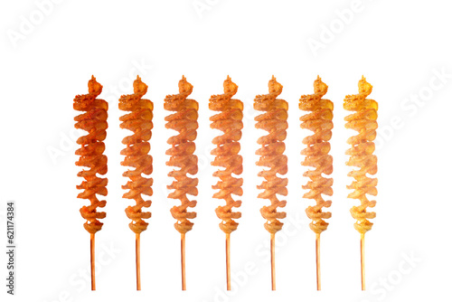 FriedTwist potato on bamboo skewers isolated on white background.