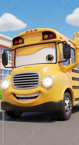 bus, school, yellow, cartoon, character, vehicle, transport, transportation, children, education, learning, children, children, happy, smiling, friendly, cute, adorable, illustration, drawing, animation, three-dimensional, render, graphic, design, art, style, bright, day, sunny, sky, blue, cloud, white, building, schoolhouse, exterior, front, view, closeup, wheel, tire, headlamp, window, door, grille, engine, hood, side