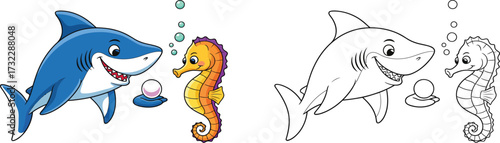 Friendly Cartoon Shark and Seahorse with a Pearl
