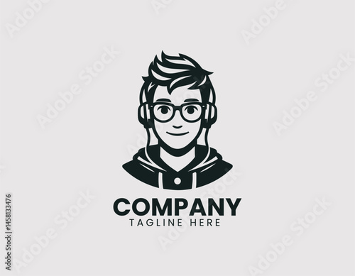 Friendly Cartoon Young Man Glasses Earbuds Portrait Vector Logo Design, Cheerful Cartoon Guy Glasses Earphones Portrait Logo, Smiling Cartoon Young Man Eyeglasses Earbuds Illustration Logo
