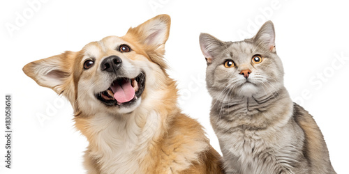 Friendly dog and cat captured in a joyful portrait, standing next to each other and looking straight into the camera. Isolated on a transparent background