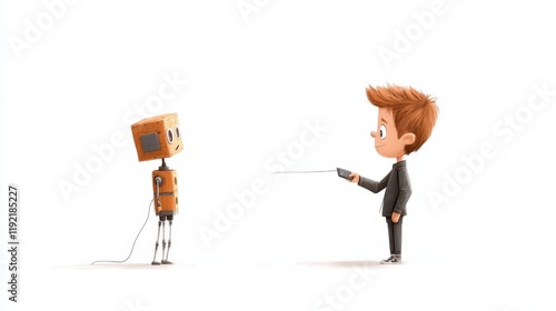 interaction, robot, boy, technology, imagination, friendship, connection, childhood, playfulness, creativity, character, design, digital, cute, education, innovation, fantasy, future, fun, emotion, storytelling, youth, entertainment, art, cartoon, playful, happy, digital artwork, modern, character, inspiration, humor, smile, casual attire, engaging, friendly, animated, children, creative, robotic, simple, elegance