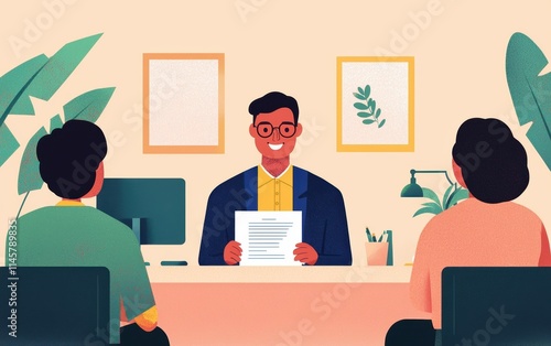 interview, candidate, smiling, meeting, office, discussion, teamwork, plant, resume, anticipation, communication, professional, presentation, desk, document, dialogue, success, workplace, diversity, career, relation, recruitment, job, hiring, warm, engagement, interaction, colours, illustration, environment, scene, background, confidence, friendly, eye, attire, people, smile, positive, light, creative, design, planning, strategy, openness, conversation