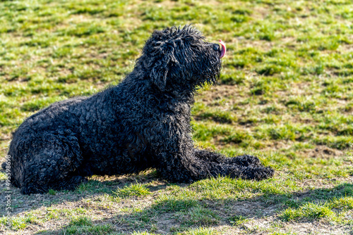 friendly shaggy black dog, shepherd dog posing, pet on spring walk